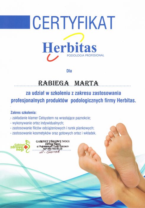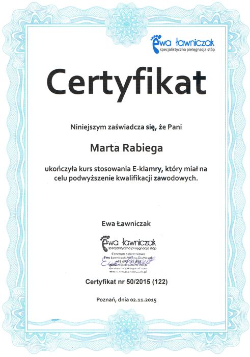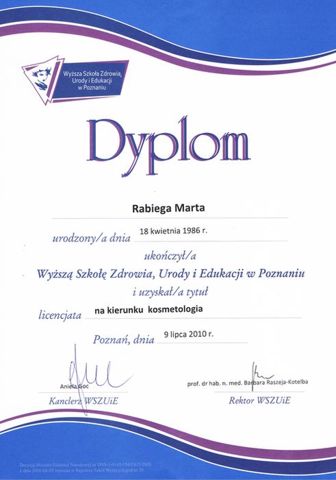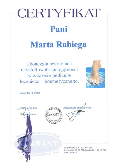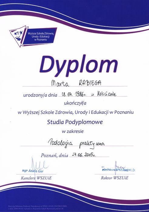 Jestem absolwentką kosmetologii w Wyższej Szkole Zdrowia, Urody i Edukacji w Poznaniu. Ukończyłam również studia podyplomowe na kierunku Podologia. Zawsze bardziej interesowały mnie przypadki medyczne niż kosmetyczne, dlatego zajęłam się problemami stóp. Staram się rozwijać moją wiedzę na różnych szkoleniach podologicznych.